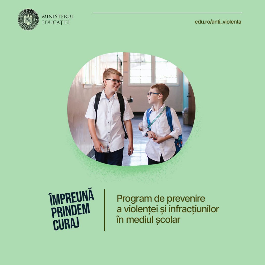 În perioada noiembrie 2023 – august 2024, se desfăşoară în toate judeţele ţării şi în municipiul Bucureşti programul de prevenire a violenţei şi infracţiunilor în mediul şcolar denumit „ÎMPREUNĂ PRINDEM CURAJ”. Acest program, aprobat prin OME Nr. 6631/10.11.2023 (disponibil la https://edu.ro/anti_violenta), se concentrează pe sprijinirea şcolilor pentru crearea unui mediu sigur şi propice învăţării.